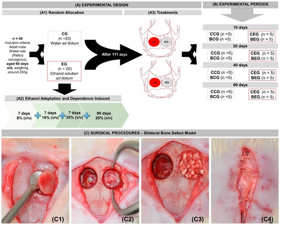 (A) Experimental design. (A1) Random Allocation—Forty adult male Wistar rats, (Rattus norvegicus), aged 60 days old, weighing around 250 g were divided into two broad groups: CG—Control group (n = 20)—that received only water with liquid diet and EG—Experimental group (n = 20)—that received ethanol solution 25% (v/v) with liquid diet after adaptation period. (A2) Ethanol Adaptation and Dependence Induced—Animals were gradually drunk at progressive concentrations of ethanol solution (8–16–25% v/v). After 21 days of alcohol adaptation, the animals remained at 25% (v/v) until the surgical procedure for 90 days. (A3) Treatments—After surgical procedures—bilateral bone defect model in the parietals, four subgroups were preformatted according to treatment (blood clot vs. biomaterial) and clinical conditions (alcoholic vs. non-alcoholic): Animals that received only water with liquid diet: CCG (right parietal bone defect was filled with blood clot) and BCG (left parietal bone defect was filled with biomaterial); Animals that received ethanol solution 25% (v/v): CEG (left parietal bone defect was filled with blood clot); BEG (right parietal bone defect was filled with biomaterial). B) Experimental Periods—at 10, 20, 40 and 60 days the skulls of 5 animals/group were collected, totalizing 5 defects/period of each subgroup CCG, BCG, CEG and BEG. (C) Surgical Procedures–Bilateral Bone Defect Model–(C1) 5-mm left parietal osteotomy; (C2) Two bone defects in parietal bones; (C3) One defect filled with biomaterial and the contralateral only with blood clot; (C4) Periosteum suture with nylon 5-0.