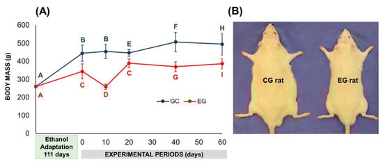 (A) Graphic representation of body mass (g) during ethanol adaptation-induced dependence (111 days) and experimental periods of control (CG-water ad libitum) and experimental (EG-ethanol solution ad libitum) groups. (B) Comparison between body masses of CG vs. EG showing the negative effect of alcohol. Different letters p < 0.05 (independent t-test and paired t-test showed interaction between group and period).