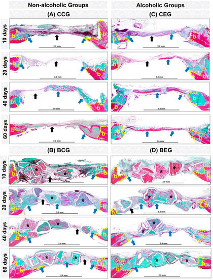 Panoramic histological views in skull defects created in the animals (A–D). Non-alcoholic (A,B) and alcoholic (C,D) treated with blood clot or biomaterial at different experimental periods, 10, 20, 40 and 60 days. (A,B) Non-alcoholic Groups: showed new bone formation (blue arrows) from the defect border (b), with partial closure by fibrous connective tissue in GCC (black arrows) or by particles of biomaterial surrounded by fibrous connective tissue in BCG (asterisk). (C,D) Alcoholic groups: new bone formation was observed from the border and on the dura-mater surface, with bone islets on the defect center in CEG and bone islets adjacent to the biomaterial particles in BEG. In both groups, at 60 days, lamellar tissue transition to compact tissue was observed (Masson’s Trichrome; original magnification ×4; bar = 2 mm).