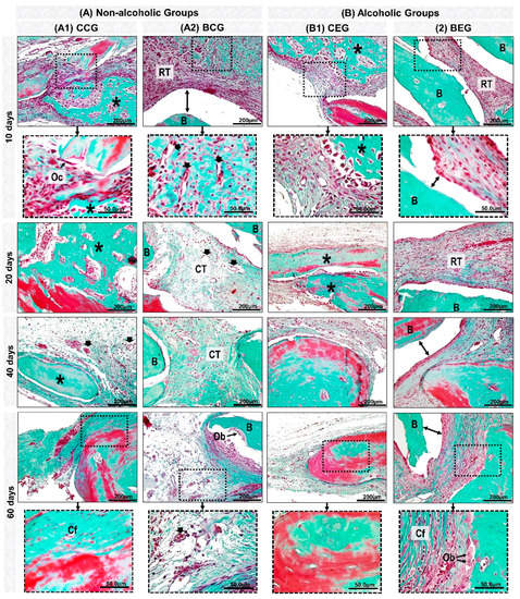 Details of evolution of bone healing of cranial defects created in the Non-Alcoholic (A) and Alcoholic (B) animals treated with blood clot or biomaterial. (A1) CCG (Non-alcoholic Group; defects filled with blood clot): at 10 days, defects showed trabecular bone formation (asterisk), with the presence of osteoclastic cells (Oc) on the edge of the remaining bone tissue. 20–40 days, the new bone formed showed bone maturation phase surrounded by blood capillaries (black arrow). At 60 days, collagen fibers were arranged in a more regular manner (Cf). (A2) BCG (Non-alcoholic Group: defects filled with biomaterial): at 10 days, defects showed tissue reaction (RT) surrounding the particles of the biomaterial (B); artifacts in histologic sections (double arrow–gap between biomaterial and tissue). Between 20–60 days, connective tissue (CT) presented scarce inflammatory cells with thin and thick collagen fibers, which were parallelly arranged at the end of the experimental period. (B1) CEG (Alcoholic Group; defects filled with blood clot): in the early periods, the defects presented inflammatory cells, decreasing at 40 days. The bone tissue formed at 60 days was predominantly compact and mature. (B2) BEG (Alcoholic Group; defects filled with biomaterial): 10–20 days, sections showed discrete bone formation, and biomaterial particles permeated by reaction tissue. In the later periods, collagen fibers were organized in parallel, and osteoblastic cells (Ob) forming a single cell line adjacent to the matrix. Masson’s Trichrome; original magnification ×40; bar = 100 μm; and Insets, magnified images ×100; bar = 50 μm.