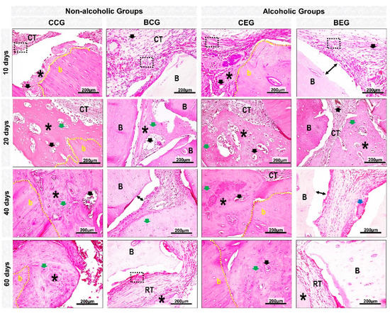 Histological details with HE staining of evolution of cranial defect bone healing created in the Non-Alcoholic and Alcoholic animals treated with blood clot or biomaterial. At 10-20 days, CCG and CEG showed the presence of richly vascularized connective tissue (CT) (black arrow) and new bone tissue (asterisk) at the defect margin (b) with trabecular arrangement. All groups presented inflammatory cells (inside the black lined area), more evident in BCG and BEG, permeating the particles (B). At 40 days there was typical lamellar arrangement, interspersed with osteocytes (green arrow), and in BCG and BEG inflammatory cells and multinucleated giant cells (blue arrow). At 60 days, bone tissue was mature and compact in defects filled with blood clot, there was decreased inflammatory reaction in BCG and BEG groups and regularly organized collagen fibers. Artifacts in histologic sections (double arrow–gap between biomaterial and tissue). HE; original magnification x 40; bar = 100 μm.