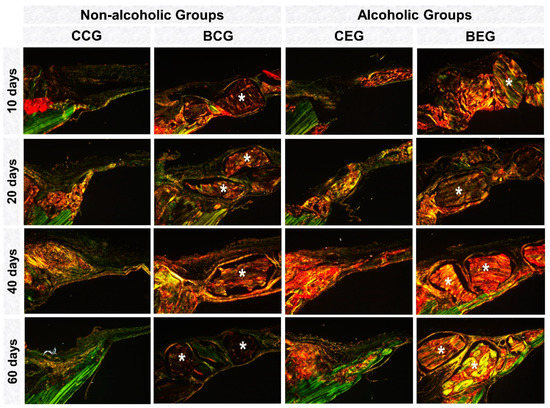 In the final periods, 40–60 days, in non-alcoholic groups (CCG and BCG), the bone collagenous matrix was more organized with green-yellow birefringence than the alcoholic animals (Figure 6).