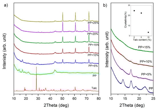 XRD patterns of (a) pure talc powder, polypropylene, and samples with different talc content and (b) an enlarged range of the diffraction pattern for 2θ from 10° to 25°. The inset presents the relation between the crystallinity degree and the talc content.