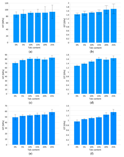 Noteworthy are the results calculated for particular talc concentrations and the resultant relation between the measured mechanical parameters and penetration depths. As shown in Table 1 and Table 2 the inverse linear dependence between the hardness and elasticity module and the depth of indentation is recorded. As the depth of indentation increases, a decrease in the values of the tested parameters can be observed. An increasing talc concentration did not influence the general trend observed for HIT and EIT parameters, however for a 25 wt.% talc content the lowest differences in HIT and EIT between particular depths were detected. As mentioned in the introduction section, a wide range of works show that the indentation hardness and elasticity modulus for polymers decrease along with an increasing indentation depth [24,25,26,50]. The observed effect can be caused by various factors, including surface effect, changes in the glass transition temperature, adhesion forces, indentation-tip bluntness, and material inhomogeneity, [24] all being a result of the relatively complex polymer structure and their temperature and pressure-dependence behavior. Taking into consideration the results obtained by other authors [24] it can be concluded that increasing the talc content can influence the homogeneity of the observed composites thereby reducing the extent of the effect of the dependence of the mechanical parameters on the size of the indentation.