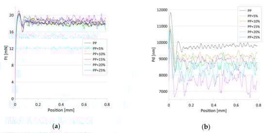 In the case of thermoplastic matrices, additives affect the rate of crystallization, the degree of crystallinity, and the nature of the crystalline phase. Due to the fact that the talc constituted a significant percentage of the content, and that the plasticization process took place at temperatures above 200 °C, a strong exfoliation process took place. On one hand, the exfoliation process can lead to the disappearance of the polymeric structure and, on the other hand, the formation of a new phase from the additive. Our XRD measurements for samples with talc suggest the occurrence of this process. For samples with additives, X-ray diffraction profiles did not show peaks from the layered structure of talc. However, they revealed peaks derived from the structure of filler components. The intensity of these peaks rose with the increase of additives in the surface layer of the sample. It was observed that dominant peaks were located at 2θ = 50.29°, 60.81°, and 71.89°.