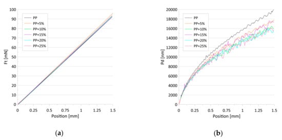 Figure 7 presents the dependence of the friction force (a) and penetration depth (b) on the scratch positions for the progressive loads. No differences were found in the value of the friction force in relation to the talc concentration. The penetration depths, in turn, decreased with the talc content for both the constant and progressive loads (Figure 6b and Figure 7b). The observed effect can be associated with the increase in the indentation hardness and the indentation modulus with the growing concentrations of talc in the composites. Research has revealed that talc filling increases the scratch resistance of the PP/talc compound [51], mainly due to the fact that talc particles cause an increase in nuclei density [46,52], which translates into increased hardness. However, in [53] it was shown that talc-filled PP has poor scratch resistance irrespective of the addition of a modifier or a lubricant.