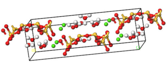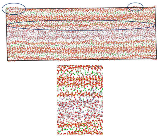By using MD simulation software, Hou proposed a method for testing ion diffusion coefficient under electric field [28]. In this study, the tools of “Cleave” and “Build Vacuum Slab” are employed to perform the molecular modeling of NaCl in the C-S-H pore structure [19,29,30]. The tool “Cleave” is employed to obtain the corresponding size model according to different needs, and the tool “Build Vacuum Slab” combines multiple types of models to form a composite model. Using the tools of “Cleave” and “Build Vacuum Slab”, a NaCl structure model with a size of 6.732 Å × 7.369 Å × 15 Å is obtained, in which case, the three designed facets, (1 0 0), (0 1 0), and (0 0 1) plans, of the NaCl solution model shown in Figure 2 are cut. By using the tool “Build Layer”, the C-S-H model and the NaCl solution model are then spliced into a C-S-H pore structure model with pore sizes of 1.5 nm and 3 nm, which is filled with 8% NaCl solution. The obtained model is a single cell structure which needs to be expanded to a supercell structure. To provide a better description of the C-S-H pore structure but without increasing extra computational efforts, a 30 × 2 × 1 super-cell structure is generated, which makes the simulation result closer to the real condition. The obtained initial structure is not stable, in which case, an optimization process must be performed to obtain a stable structure with the lowest energy. After optimization, a stable C-S-H pore structure is established, as shown in Figure 3. Using the Voigte–Reusse–Hill method [31], the calculated elastic modulus of C-S-H molecular model are 16.79 GPa, which is consistent with the experimentally obtained values (18.1 ± 4 GPa) of low-density C-S-H by Jennings [32].