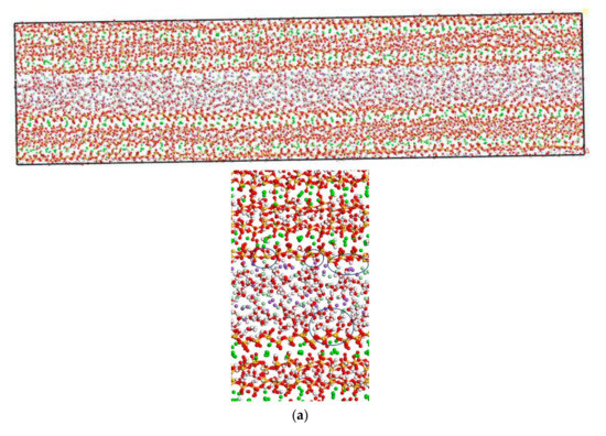 In this section, the transport properties of NaCl in C-S-H nanopores with different pore sizes and structural organization changes are investigated using the model constructed in Figure 3. Snapshots of molecules in the C-S-H pore structure after the completion of computation are shown in Figure 6. It is observed from the figure that the interlayer spacing of C-S-H is stable. Some chloride ions and sodium ions are transported to the wall of the pore structure. The number of chloride ions transported to the pore wall decreases with increasing pore size, which can be attributed to the interaction potential of the pore wall on chloride ions decreasing with increasing pore size [17].