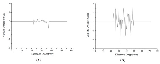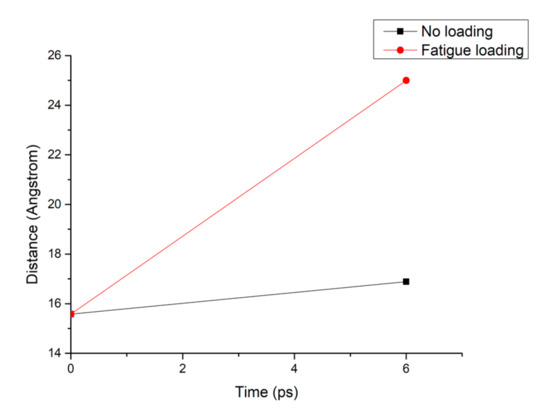 The chloride ion diffusion rate perpendicular to the C-S-H nanopores with a diameter of 1.5 nm is calculated as shown in Figure 9. The figure shows that the chloride ion diffusion rate perpendicular to the C-S-H nanopores after the completion of fatigue loading is 4 times faster than that without fatigue loading. For the C-S-H nanopores without fatigue loading, Cl− appears in the range of 20–40 Å. For the C-S-H nanopores under fatigue loading, Cl− appears in the range of 20–50 Å, which indicates that the fatigue load forces a large amount of Cl− into the pore wall. Ca2+ in the pore wall creates the potential for Cl-, which attracts Cl− to move to the pore wall, thus affecting the chloride ion diffusion rate. As is shown in Figure 7, the application of loading leads to the weakness of the stiffness and cohesive force of C-S-H, in which case, different deflections and bending of calcium silicate sheet can be observed [38]. The discrepancy between interlayer connections results in the inhomogeneous diffusion of chloride ions in C-S-H pore structure.