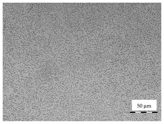 Optical microscopy (OM) microstructure image of etched Ti6Al4V specimen composed of two phases: light α and dark transformed β (etched).