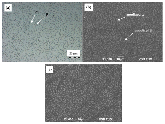 The morphology of as-anodized and anodized-heat-treated samples was observed only by SEM in SEI (secondary electron image) mode. Unlike in optical microscopy (OM) Figure 2a, coloration of both phases in SEM SEI images appears quite conversely: α-phase is observed as dark areas and transformed β-phase as light areas, as seen in Figure 2b. The comparison of the SEM surface morphology of as-anodized and anodized-heat treated samples is presented in Figure 2b,c that revealed the obvious dependence of NT growing on initial α + β microstructure. Appearance of the NT surface after annealing seems to be unchanged.