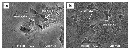Details of SEM SEI images of the anodized surfaces (a) ground and (b) polished.