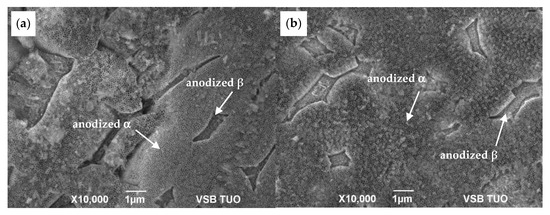 Figure 3 shows the regions of transformed β-phase covered by NT, whose features differ considerably from that over the α-phase areas. The non-uniform appearance of the NT layer is caused by the different electrochemical reactions of both phases resulting from their different chemical composition and crystalline structure. Differences between α- and β-phases in Ti content [14] play an important role in the growth of the oxide layer in the EG electrolyte at higher potentials applied [7,8,9,10]. Moreover, diffusion coefficient of Ti atoms varies for both phases, so the bimodal α+β microstructure significantly affects the regularity and homogeneity of the NT surface layers. The rate of oxide layer growth at anodization should be faster for β-phase, thanks to quicker Ti diffusivity into the BCC structure but controversial process of the TiO2 dissolution during NT growth proceeds preferentially over the β-regions due to content of vanadium as a β-stabilizing element [15,16]. Thus, the bimodal structure of the Ti6Al4V substrate surface resulted in two distinct NT morphologies.