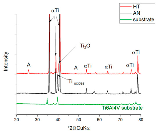 XRD patterns of the samples as-anodized (AN), anodized-heat treated (HT), and substrate. A–anatase (ICDD 01-089-4921), α Ti–alpha titanium (01-089-3725), Ti2O–(ICDD 01-089-4921).