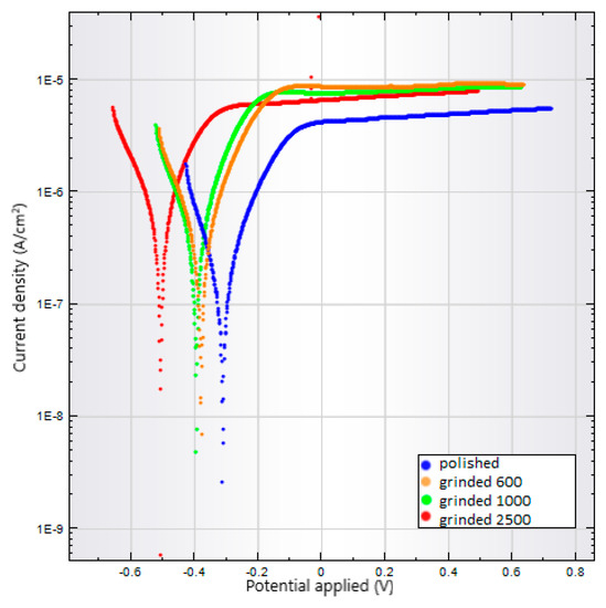 For the first group of samples whose surfaces were finished by grinding, an increase in the corrosion rate is observed with increasing Grit number of grinding paper. The increasing rate corresponds to the decreasing corrosion potential and increasing corrosion current density. When higher Grit of the grinding papers was used, larger active surface of the substrates was produced. Conversely, the polished sample with smooth and reduced active surface shows decreased corrosion rate. The polarization curves in Figure 9 show distinct shift to more negative values of corrosion potential for ground samples comparing to the polished surface.