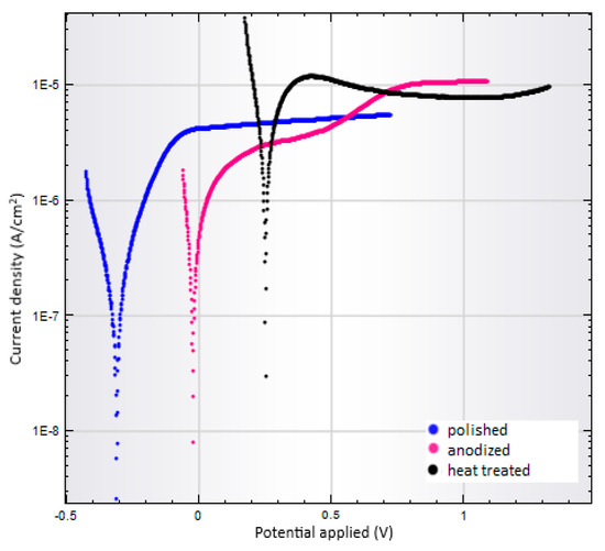 Polarization curves of a polished, as-anodized, and anodized-heat treated Ti6Al4V samples.