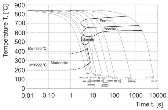 Real DTTT diagram for 20MnB4 steel [55]. Reproduced with permission from Laber, K., Koczurkiewicz, B., Determination of optimum conditions for the process of controlled cooling of rolled products with diameter 16.5 mm made of 20MnB4 steel, Proceedings of the 24th International Conference on Metallurgy and Materials—METAL 2015; published by Tanger Ltd., 2015.