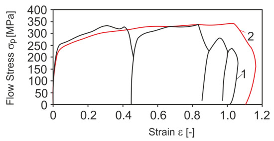 As the results from the data presented in Figure 2 show, the level and course of changes in yield stress are similar in both cases. Slight differences only appear at the end of the deformation. This may be due to the fact that in the last two deformations (curve No. 1) the achieved strain rate was about 50 s−1 and 28 s−1 and it was lower than the set values (213 s−1 and 141 s−1). The reason for this is the short break time between deformations, preventing the achievement of such high strain rates. Based on the obtained research results, it was found that replacing the sequence of the last four deformations with one deformation will not cause a large error in the analysed case [58].
