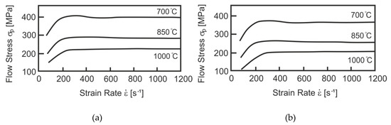 Another important problem during the physical modelling of the rolling process is the high strain rate, which in the final stage of the analysed process exceeded 2000 s−1. Due to the inability to use such a high value of strain rate during the physical modelling of rolling with the GLEEBLE 3800® simulator, a strain rate of about 250 s−1 was used, utilizing the research results published in [31], in which the authors conducted studies on the impact of high strain rates on yield stress, for various steel grades. These studies were conducted on a specially constructed device in which the deformation conditions were similar to those found in the actual rolling process of wire rod. Figure 3 shows the results of changes in yield stress for steels with a chemical composition similar to low-carbon steels for cold upsetting for various deformation conditions.