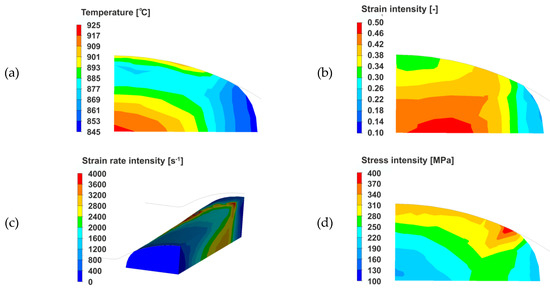Sample results of numerical modelling of wire rod rolling process for rolling stand No. 1 in the RSM rolling mill block (rolling pass No. 28 in whole rolling period): (a) temperature distribution in strip exit plane from the strain zone; (b) strain intensity distribution in strip exit plane from strain zone; (c) strain rate intensity distribution; (d) stress intensity distribution in strip exit plane from strain zone.