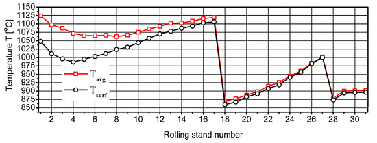 Figure 5 shows the temperature changes throughout the rolling cycle. Analysing the data presented in Figure 5, it was found that after the deformation process of the tested steel in rolling stand No. 1, the temperature of the cross-section of the rolled strip was about 1125 °C, while the average temperature of the side surface of the strip was about 1050 °C. During rolling in the continuous medium rolling mill, a decrease in the strip temperature value was found at the initial stage of the rolling process, in the box groove system when small elongation coefficients are used and the rolling rate is relatively low. Due to the long contact time of the strip with the rollers and the long break times between successive passes, strong cooling of the surface of the rolled strip occurred.