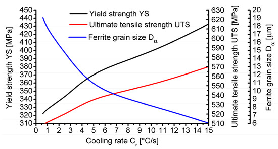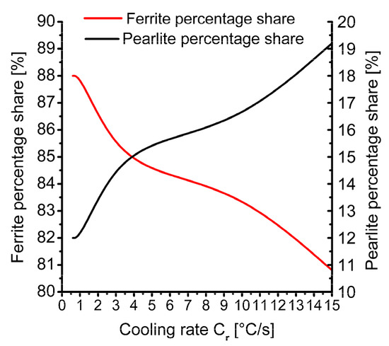 where: Dα—ferrite grain size, Cr—cooling rate, , , , —volume fractions: ferrite, perlite, bainite, martensite.