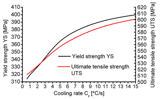 Figure 7 presents the research results on the impact of the cooling rate on the change in selected mechanical properties of 20MnB4 steel obtained during numerical modelling using the QTSteel® program.