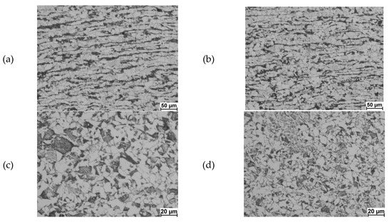 Microstructure of 5.5 mm diameter wire rod of 20MnB4 steel after rolling process in industrial conditions: (a,b) cooling method W1-4; (c,d) cooling method W1-5; (a,c) longitudinal section, magnification 200×; (b,d) cross-section magnification 500×.