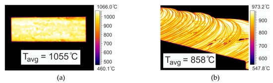 Thermogram examples of temperature distribution on wire rod surface: (a) before rolling mill stand No. 1; (b) at entry to roller conveyor of STELMOR® line.