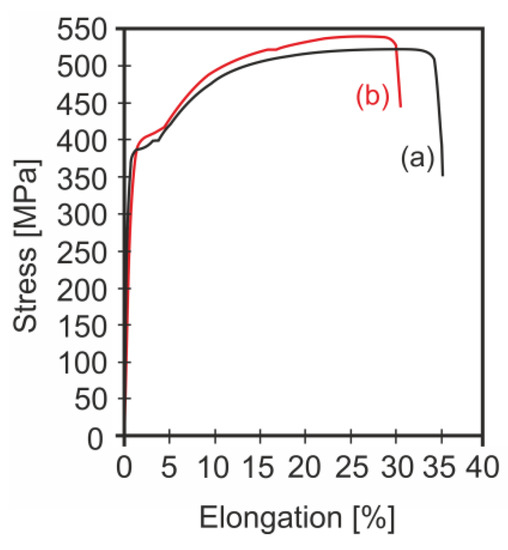 Examples of tensile curves of 5.5 mm diameter wire rod made of 20MnB4 steel: (a) cooling method W1-4; (b) cooling method W 1-5.