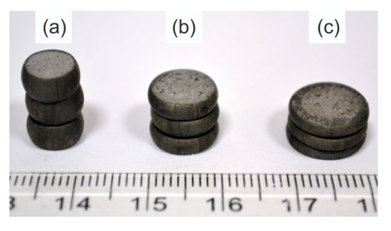 The final stage of industrial research was to determine the capacity of the obtained 20MnB4 steel wire rod for further cold forming. To achieve this aim, studies were carried out in upset tests in accordance with PN-83/H-04411 [63]) and assessment of the surface quality for possible cracks. An exemplary view of samples after the upsetting process is shown in Figure 14.