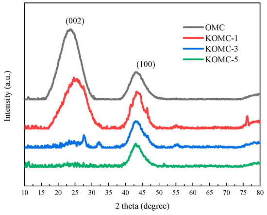 The OMC samples before and after activation with KOH were distinguished by wide-angle XRD, as shown in Figure 5. The wide-angle XRD pattern of OMC showed two typical peaks at 2-theta of 23.48 and 43.26, corresponding to (002) and (100) planes of graphitic carbon, respectively [22]. The weak (002) diffraction peak intensity implied the low degree of graphitization of the carbon material [34], signifying that the activated process had reduced the degree of graphitization. Nondistinct (002) diffraction peaks indicate the amorphous feature of sample KOMC-3 and KOMC-5. The disappearance of the (002) diffraction peaks of KOMC-3 and KOMC-5 may be due to the deep damage of the graphite layer arrangement during the activation process with the increase of the amount of KOH [35,36]. KOH activation improves the porosity on the premise of reducing the ordering of OMC, which enhances the adsorption performance to a certain extent. It can also be seen from Figure 5 that KOMC-1 and KOMC-3 have weaker peaks. This may be because the potassium compound or other Impurities were not completely washed during the washing process. Analysis results based on Raman spectra and wide-angle XRD patterns were consistent with the amorphous structure observed by TEM and low angle XRD patterns.