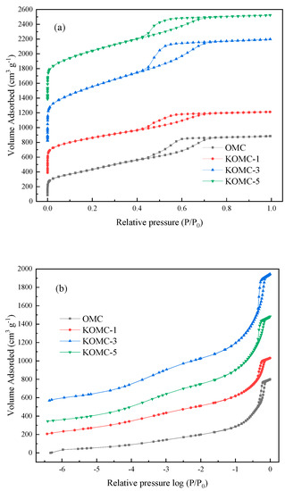 Figure 6a,b show N2 adsorption-desorption isotherms of the OMC and KOMC-x samples at −196 °C. The pore structural properties are listed in Table 1. The adsorption-desorption isotherms of all samples equal to the mixed type I and type IV definition in the IUPAC classification. There is an H1 type hysteresis loop in the P/P0 range of 0.4–0.8, indicating that all samples have the micro-mesoporous structure [37,38]. The log scale isotherms show the micropore filling process between the different samples on the lowest relative pressure, indicating that micropores were present in the prepared samples. The BET-area and total pore volume increased with the increase of the KOH/OMC ratio (Table 1). For instance, the pure OMC BET-area was 1343 m2 g−1, while that of KOMC-1 and KOMC-5 was 1792 m2 g−1 and 2661 m2 g−1, respectively. Moreover, total pore volume increased from the original 1.24 cm3 g−1 OMC to 1.32 cm3 g−1 in the KOMC-1 and 2.14 cm3 g−1 in the KOMC-5. This means that well-developed pores were generated when the amount of KOH was appropriately increased.