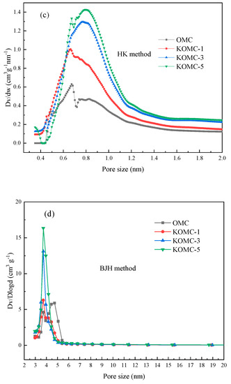 Micro-mesopore pore size distribution curves of OMC and KOMC-x, shown in Figure 6c,d, were analyzed using the HK and BJH methods, respectively. The BJH mesopore size distributions showed that the mesopores primarily lay within the rangee of 3.5–5 nm for the four prepared OMCs. Still, the pore diameter of the mesopores was significantly reduced after activation. This may be the etching effect of the potassium, as mentioned earlier, metal on the carbon material. It can also be found from the HK micropore size distribution that the micropores were mainly distributed in the range of 0.6 and 0.9 nm, which were considered to be the optimum pore size for adsorbing toluene [39]. The increase of micropore volume and micropore surface area of the KOMCs indicate that KOH activation influenced the pore structures. The DFT method-determined pore size distribution is provided in Figure S1 of Supplementary Materials.