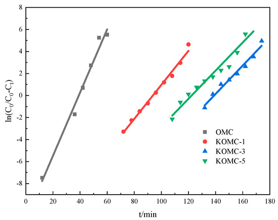 Breakthrough measurements are recognized as an effective means of evaluating adsorbents [40]. The breakthrough time is the most crucial parameter, reflecting the adsorption capacity of an adsorbent [41]. In this paper, the breakthrough and saturation mean the ratio of toluene outlet to inlet concentration is greater than 10% and 90%, respectively. Breakthrough mode generally consists of two processes [42]. The breakthrough curve was a horizontal line in the initial stage. The toluene concentration of the gas outlet gradually increased after breakthrough, and then entered the second stage. The breakthrough curves with an error bar of OMC, KOMC-1, KOMC-3, and KOMC-5 are displayed in Figure 7, and corresponding fitting lines deriving from the modified Y-N model are shown in Figure 8. It can be seen that KOMC-3 showed the longest toluene breakthrough time (129 min) in the first stage of dynamic adsorption, followed by KOMC-5 (108 min) and KOMC-1 (81 min). It is clear that OMC exhibit the minimum breakthrough time (33 min) for toluene. The adsorption capacities of toluene decreased in the order of KOMC-3 (355.67 mg g−1) > KOMC-5 (286.76 mg g−1) > KOMC-1 (242.89 mg g−1) > OMC (104.61 mg g−1) (Table 2). However, compared with OMC, KOMC-x (1, 3, 5) gradually increased with time in the second stage of the toluene breakthrough curve, which indicates that the increase in microporous structure will increase the resistance to mass transfer slightly. In contrast, the toluene breakthrough curve of OMC increased sharply in the second stage, which means that the diffusion resistance in OMC is smaller, and the mass transfer rate is faster during the adsorption process. The dynamic adsorption results show that KOMC-3 has excellent adsorption performance, its dynamic adsorption capacity is higher than OMC, and its mass transfer resistance is less than KOMC-5. Hu et al. used cotton stalks as carbon source and zinc chloride as an activator for chemical activation. The AC-Z dynamic adsorption capacity of the prepared sample was 258 mg g−1 [43]. From the above experimental results and Table 1, it is known that the specific surface area and pore volume of OMC were increased after activation, following which the adsorption capacity is also enhanced. However, van der Waals force is the main attraction of physical adsorption, which increases with the increase of specific surface area, so the adsorption capacity increases after activation [44]. The adsorption capacity was generally expected to increase as the specific surface area and pore volume increased. As can be seen from Table 1, the specific surface area and pore volume of KOMC-3 were smaller than those of KOMC-5, but the breakthrough time of KOMC-3 was larger. This means that the factors affecting adsorption consisted of more than a specific surface area and pore volume.