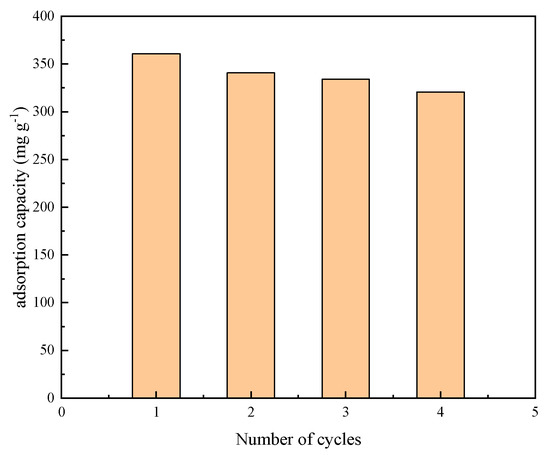 The recyclability and stability of adsorbent are much important for practical applications. To evaluate its reusability, the KOMC-3 was regenerated through the heating of the materials at 200 °C in a nitrogen gas flow for 120 min. The regenerated samples were then subjected to three times adsorption-desorption cycles, and the change in equilibrium adsorption capacity was observed. Figure 9 shows the change in the adsorption capacity of KOMC-3 for 4 adsorption cycles.