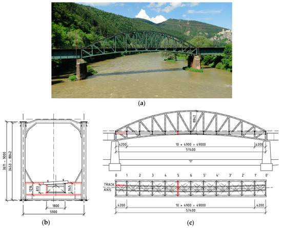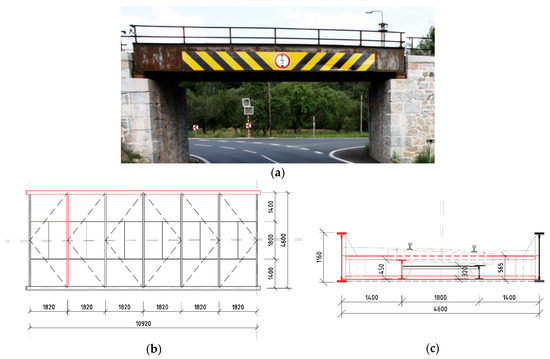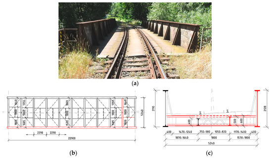 Bridge 1: the 142-year-old plate girder bridge with a bottom open member deck: (a) picture from the side; (b) schematic ground plan of the superstructure; (c) cross-section of the bridge; the chosen elements are drawn in red in (b) and (c).