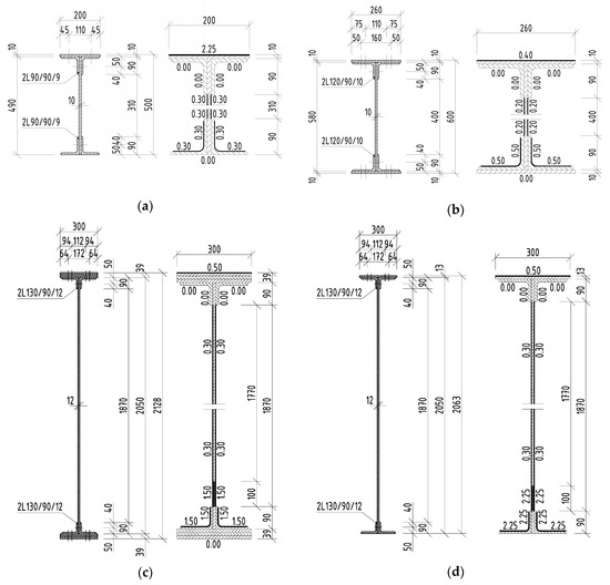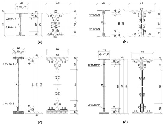 Riveted I-sections and average corrosion losses of elements in the case of Bridge 1: (a) left stringer; (b) crossbeam; (c) left main girder in the midspan; (d) left main girder in the support zone.