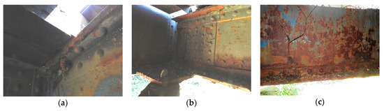The photos in Figure 7 illustrate the conditions of some structural elements or the details of one of the bridges. Obviously, the corrosion attack was not always necessarily uniform and depended greatly on the position of a particular member or element in the structure, as well as on the position of the measured local point on the element itself.