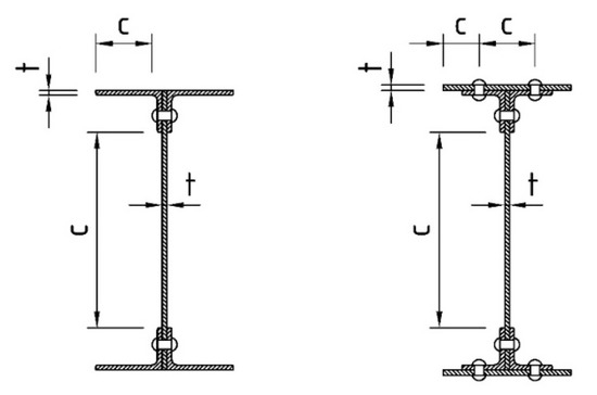 For the classification of the riveted cross-sections, the widths of the respective parts of the cross-section are defined in Figure 8. In contrast to the welded cross-sections, it was also necessary to verify the classification in terms of the distance of the rivets parallel to the direction of the applied stresses in addition to the transverse direction.