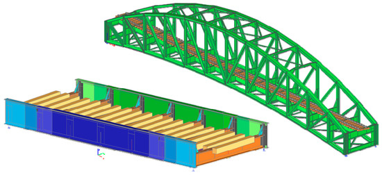 The computational models were created on the basis of long-term experience with the creation of FEM models of old and newly designed bridge structures. There is lack of space in this paper for a comprehensive description of each model and applied analysis. Therefore, only the basic features of the implemented models are given. Especially for the bridge elements, the beam finite elements were used, respecting their cross-sectional characteristics, shape variability, and mutual eccentricity. The interconnections of bridge deck members (stringer-to-crossbeam) were modeled as semi-rigid joints with stiffness on the basis of executed connections. The corner stiffeners of the main girders at the crossbeams’ locations were incorporated into the models, thus helping to approximate the real rigidity of the crossbeam connection to the main girders. Increased attention was paid to this detail to obtain stiffness that was more accurate for the lateral-torsional stability analysis of the main girders. The stiffness of bridge bearings was also taken into account. Because of the better redistribution of traffic load to the stringers, the complete railway track (rails and sleepers) was included in all models so that the wheel forces from the traffic could be redistributed more correctly, but at the same time, the model of the rail track did not significantly affect the bridge deck behavior.