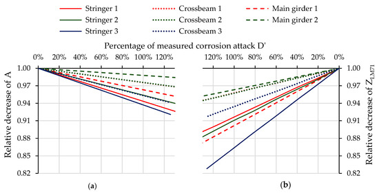 Relative decrease of the parameters of cross-sections as a function of the gradual increase of corrosion attack D’: (a) relative decrease of the cross-sectional area A; (b) relative decrease of the load-carrying capacity ZLM71 of the same cross-sections.