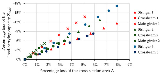 However, the governing criteria for LCC may change over time due to corrosion losses [20]. Thus, the linear dependence can be disrupted, especially in the case of very severe damages of the cross-section due to corrosion. It seemed that the speed of reduction of load-carrying capacity could be approximately 1.5–3.0 times faster than the corrosion process speed expressed by the corrosion loss within the cross-section. The faster reduction in LCC compared to the reduction of the corresponding cross-sectional area emphasized the importance of monitoring the effect of corrosion on the static safety of the bridge structure.