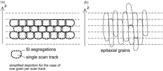 Al–Si–Mg alloys exhibit a unique microstructure in their as-fabricated state, whereby the macroscopic anisotropy characteristics are predominantly governed by the localized formation of silicon segregations; see Figure 1 [3,4]. This is in strong contrast to other alloys, like austenitic stainless steels or Inconel, with their dominating characteristic being their grain morphology [5,6]. The cause for the major impact of the Si-segregations is thought to be their location, as they occur most prevalently in remolten areas, i.e., in the bonding areas between single scan tracks and subsequent layers [7]. Compared to the aluminum solid solution (α-Al), the Si-segregations are brittle and prone to shear fracture [8]. Due to the layer-wise building approach in the LPBF process, these embrittlements repetitively occur every single layer and become the governing weakness, defining the observable macroscopic properties, as has been documented for tensile and compression strength as well as for the fracture toughness [8,9,10,11,12]. Even though these weaknesses are present, LPBF Al–Si–Mg alloys exhibit superior mechanical properties compared to their cast counterparts, at least under static loading, while the fatigue performance suffers from surface roughness and sub-surface defects [13,14].