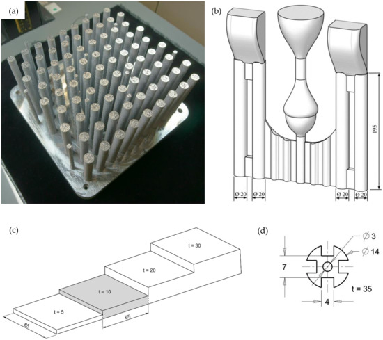 (a) Laser powder-bed fusion (LPBF) samples on substrate plate; (b) sand-cast assembly; (c) die-cast geometry; (d) modified sample geometry for improved quenching rates in the induction furnace.
