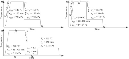 Schematic depiction of the applied heat treatments: (a) hot isostatic press; (b) dilatometer and induction furnace; (c) resistance furnace.