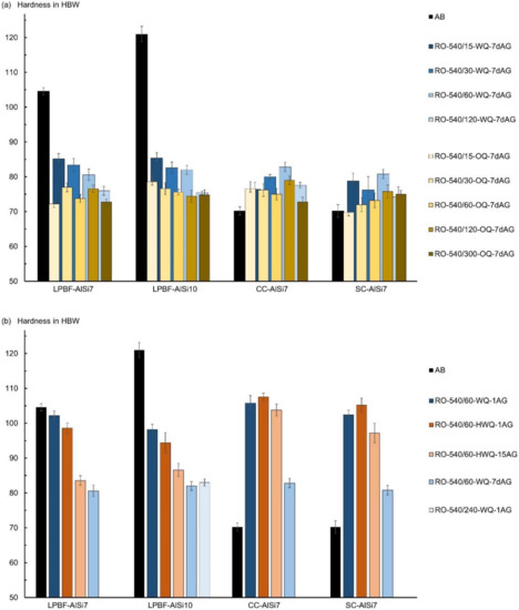 Hardness results for cast and laser powder-bed-fused samples in as-built (AB) and heat treated conditions; all results refer to heat treatments in the resistance furnace (RO) and were artificially aged (AG) for 150 min at 165 °C. Oil quenched (OQ) and water quenched (WQ) results at varying solution annealing times are depicted in (a); hot water quenched (HWQ) results and varying dwell times at room temperature are shown in (b). The utilized nomenclature is explained in detail in Table 2.