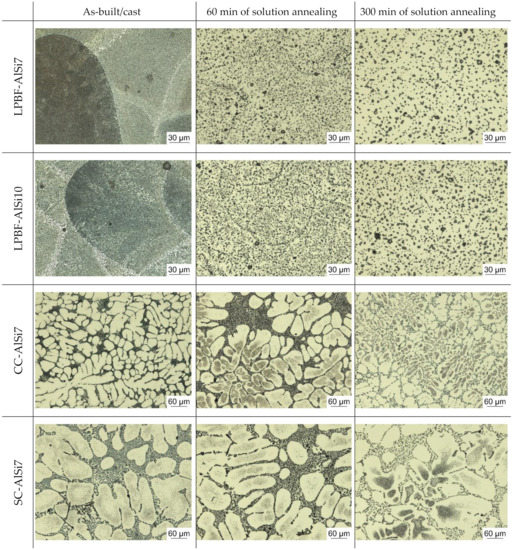 Attempting to overcome the Si-segregations via heat treatments is by no means a new approach, and numerous attempts were made in the past, albeit with limited success. Secondary artificial aging and lower annealing temperatures were shown to promote enlarged Si-particles along the remolten areas [4]. Secondary artificial aging, however, can be utilized to remove the variance in the hardening mechanisms [23]. In cast Al–Si–Mg solution, annealing is performed to homogenize the microstructure and to remove segregations in the material composition, which are induced during slow cooling and alterations in the solubility levels. For cast parts, the solution annealing is performed until a complete homogenization is achieved. In order to achieve a similarly stable microstructure at temperatures above 500 °C, it was found that Al–Si–Mg fabricated by LPBF required a much longer solution annealing time [24]. However, such a treatment drastically transforms the microstructure, and in most cases, even after rapid quenching and artificial aging, the initial hardness and strength cannot be reached again [25,26,27]. On the positive side, high cycle fatigue performance was greatly enhanced [28,29]. None of the studies returned a conclusive statement regarding an ideal post-heat treatment for Al–Si–Mg fabricated by LPBF.