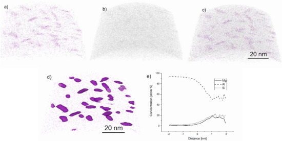 Figure 8 depicts the results of the atom probe tomography. Figure 8a shows the distribution of Mg atoms, while the distribution of Si Atoms is depicted in Figure 8b. The concentration isosurface for Mg is given in Figure 8d for a concentration of 3 at.% of Mg. These illustrate that the LPBF Al–Si–Mg alloy possesses clusters that contain both Si and Mg atoms. These clusters are needle shape with a diameter of about 2 to 5 nm and a length of 10 to 15 nm. Figure 8e is a proxigram, which illustrates the concentration of Al, Si and Mg atoms in the aluminum matrix (distance −2 to 0.5 nm) and the clusters (distance 0.5 to 2 nm).