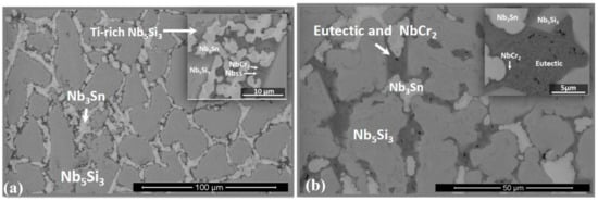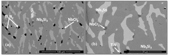 The ability to cast Nb-silicide-based alloys is a great advantage over other RMICs [4]. However, owing to their very high liquidus temperatures, cold hearth processing is required, and macrosegregation can be severe in these materials depending on alloying additions [31]. Tin, Ge, or B have a strong effect on macrosegregation [32,33,34,35,36]. The additions of Sn or Ge, which can play a key role in the suppression of pest oxidation [2,20,21,22,32,33,37,38], can also reduce the alloy liquidus temperature, depending on their concentration and other alloying elements, for example, Al, Cr, Hf, Mo, and Ti. It is believed that their role in the alloy to achieve a balance of mechanical and oxidation properties depends on their concentration in the alloy. For example, it was suggested [2,37] that Sn can be effective at concentrations up to 2 at.% and that, at this “low” content, the A15-Nb3Sn compound is not stable. This was recently shown not to be the case [32].